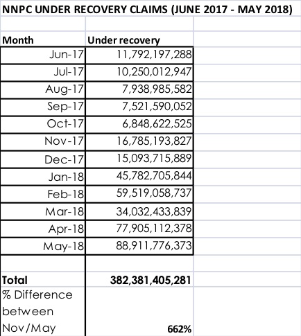 Between November 2017 and May 2018, claims rose by 662% when compared to June and October 2017, according to BusinessDay analysis of NNPC under recovery claims presented in its monthly operations and financial reports published since August 2015.